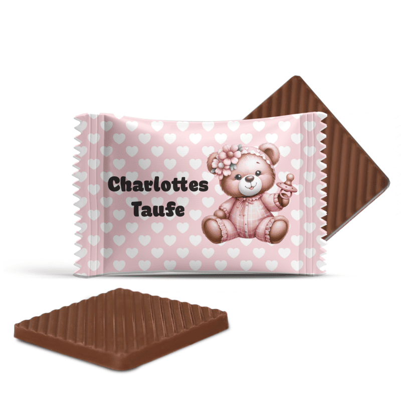 Jede Schokolade kann mit einem individuellen Text versehen werden – dem Namen des Babys, einer lieben Botschaft oder einem Dankeschön an die Gäste.