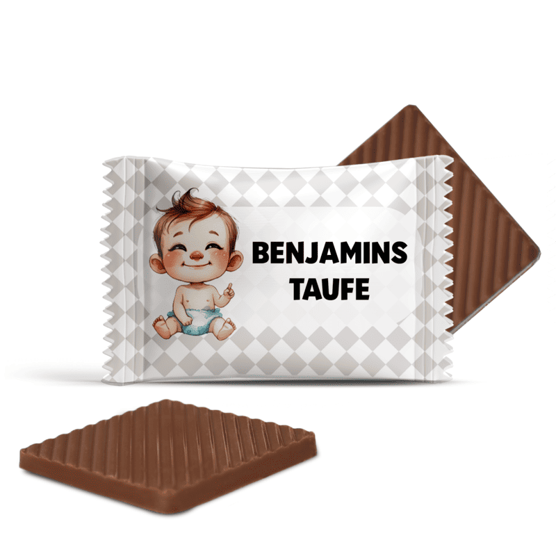 Jede Schokolade kann mit einem individuellen Text versehen werden – dem Namen des Babys, einer lieben Botschaft oder einem Dankeschön an die Gäste.