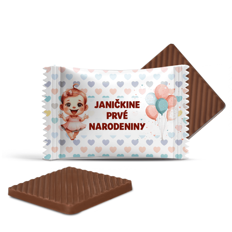Na každú čokoládku môžete pridať vlastný text – meno bábätka, milý odkaz alebo poďakovanie hosťom.