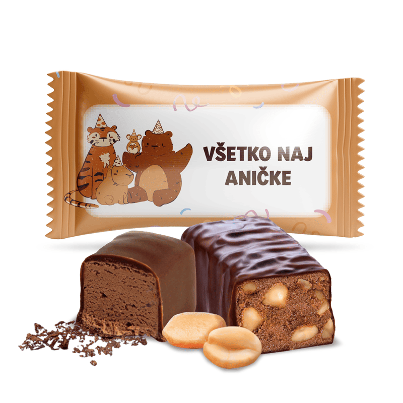 | Schokolade 21 % - Kakaomasse min. 43 % (Zucker, Kakaomasse, Kakaofett, pflanzliches Fett - Palm, Shea, Sal, Mango - in unterschiedlichen Anteilen, Emulgatoren), Erdnüsse 20 %, pflanzliches Fett (Palm), Molkenpulver (aus Milch), Kakaofaser, Kakaopulver mit reduziertem Fettgehalt, Magermilchpulver, Spiritus, Buttermilchpulver, Aroma, Emulgator: Lecithine (aus Soja). |