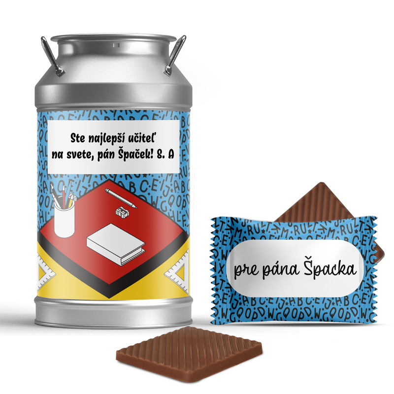 V retro kovovej dóze (80 × 145 mm; obsahuje 30 mini čokoládok) nájdeš výber čokoládok v rovnakom dizajne – samozrejme tiež s tvojím osobným textom.