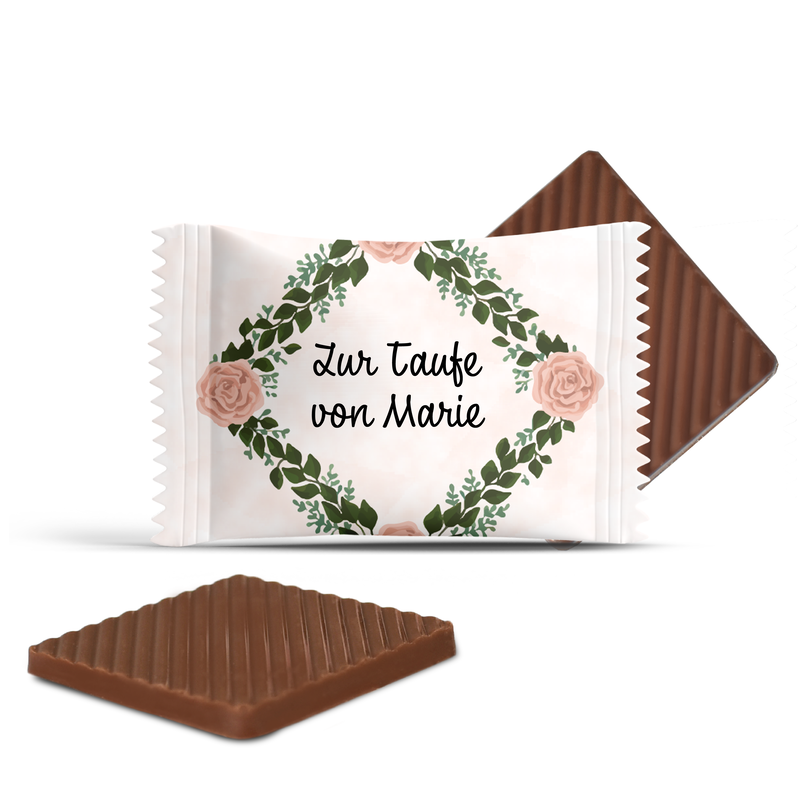 Jede Schokolade kann mit einem individuellen Text versehen werden – dem Namen des Babys, einer lieben Botschaft oder einem Dankeschön an die Gäste.